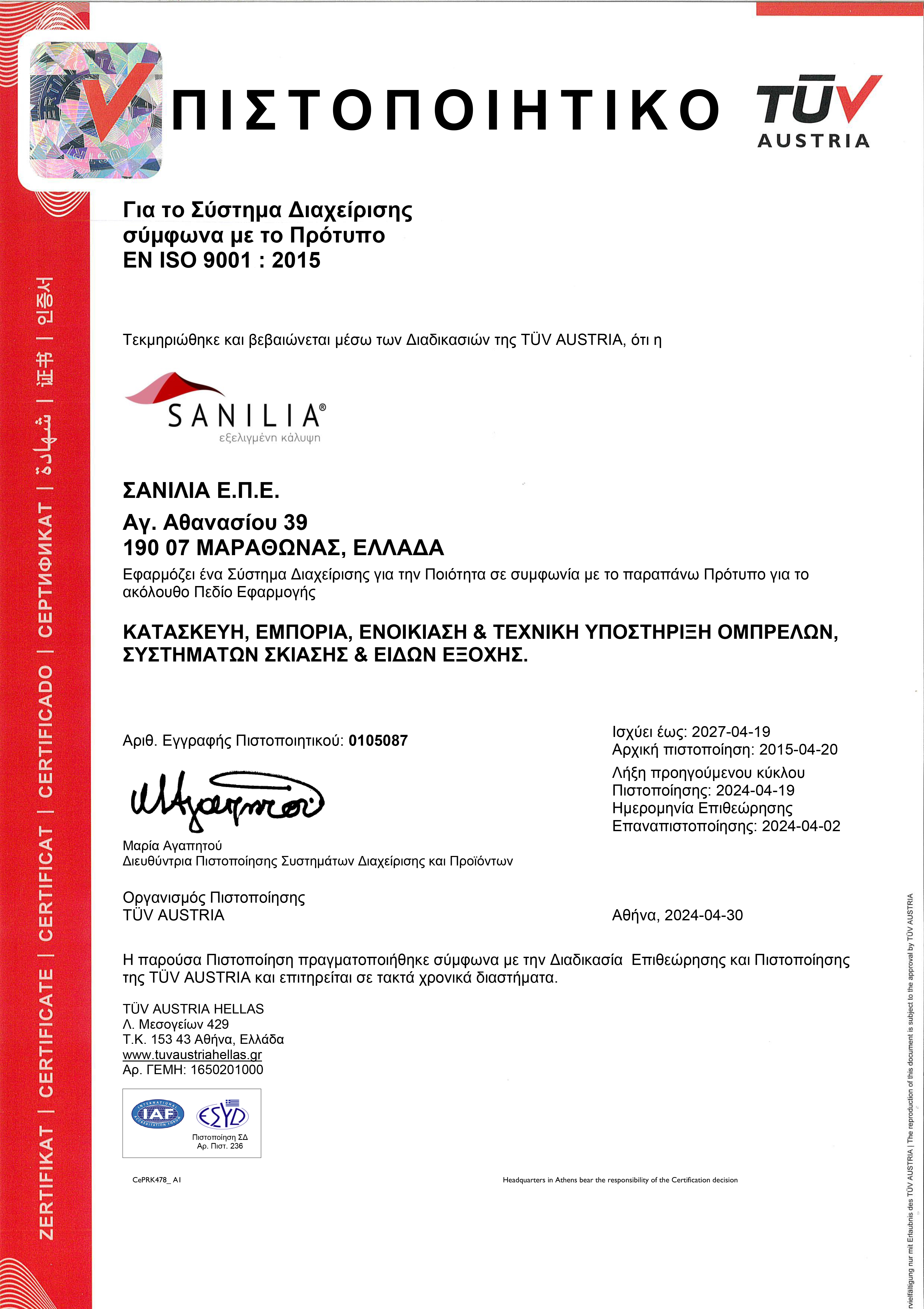 Η εταιρία Sanilia πρωτοπορώντας στον τομέα της σκίασης, έχει προβεί σε όλες τις απαραίτητες ενέργειες ώστε να διασφαλίσει
